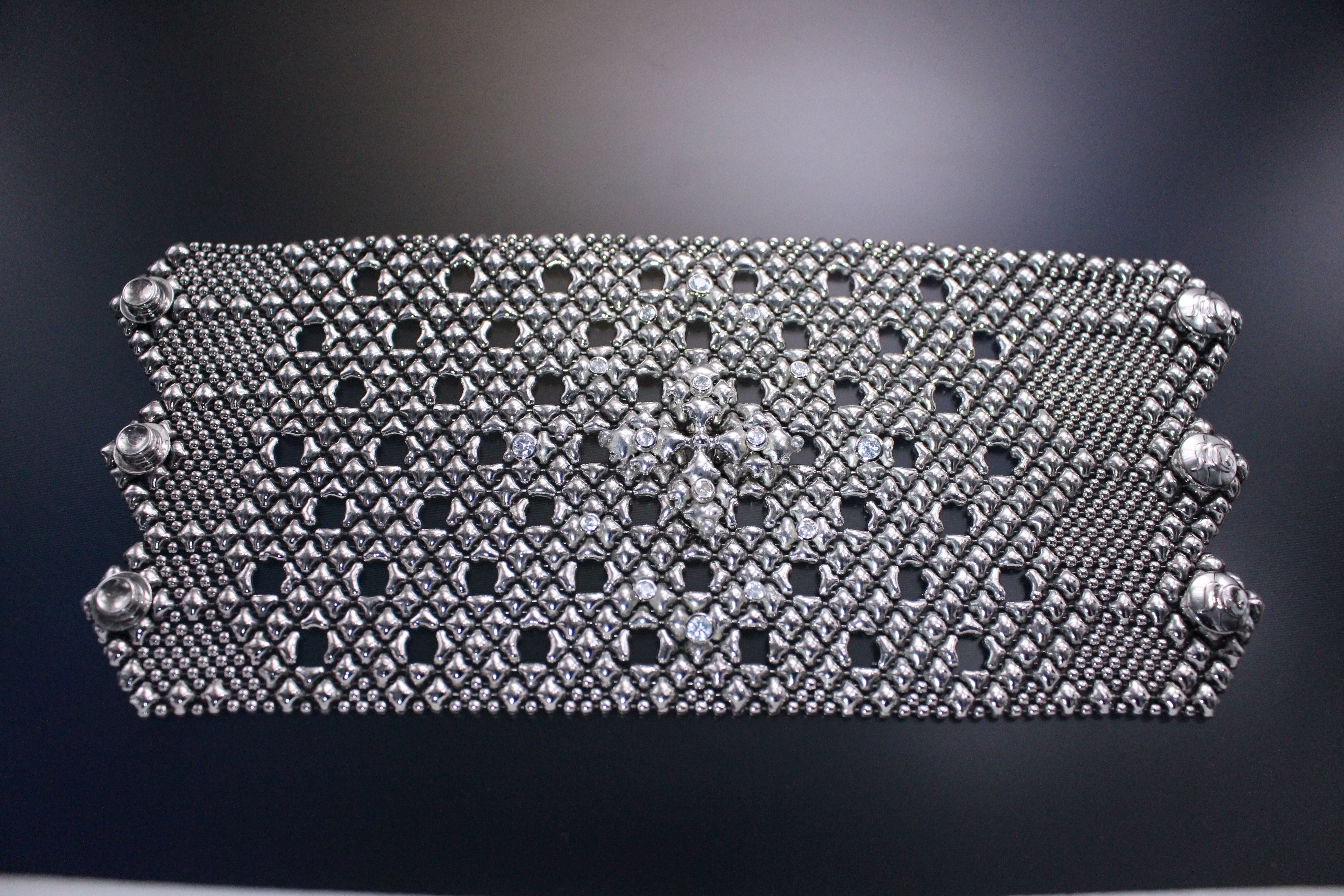 This wide meaningful rock ‘n’ roll style SG Liquid Metal bracelet by Sergio Gutierrez has 16 zircons embedded on its tracks. It was created with a strong sense of character, with a “Maltese” cross shape in the center. The rich antique silver finish, gives it a prestige look.